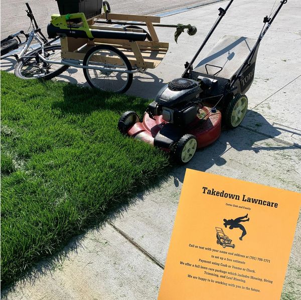 Takedown Lawn Care started over 4 years ago as a little 13 year old boy wanting to make some summer cash. Carter handed out bright orange flyers throughout the neighborhood and by his second year had three clients. He also made a trailer to tow behind his bike, which carried everything he needed. As he stands now he has serviced over 60+ clients a week and is creating more relationships every week.